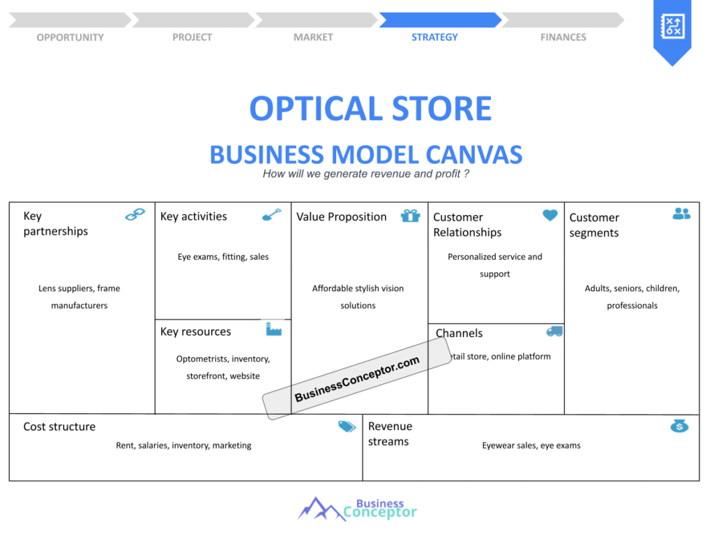 When starting an optical store, having a clear business model is crucial. The Business Model Canvas (BMC) provides a visual framework to outline your business strategy. It helps you break down your business into manageable sections, making it easier to identify strengths and weaknesses. Think of it like a roadmap. Instead of getting lost in details, the BMC gives you a bird’s-eye view of your business, highlighting where you should focus your efforts.