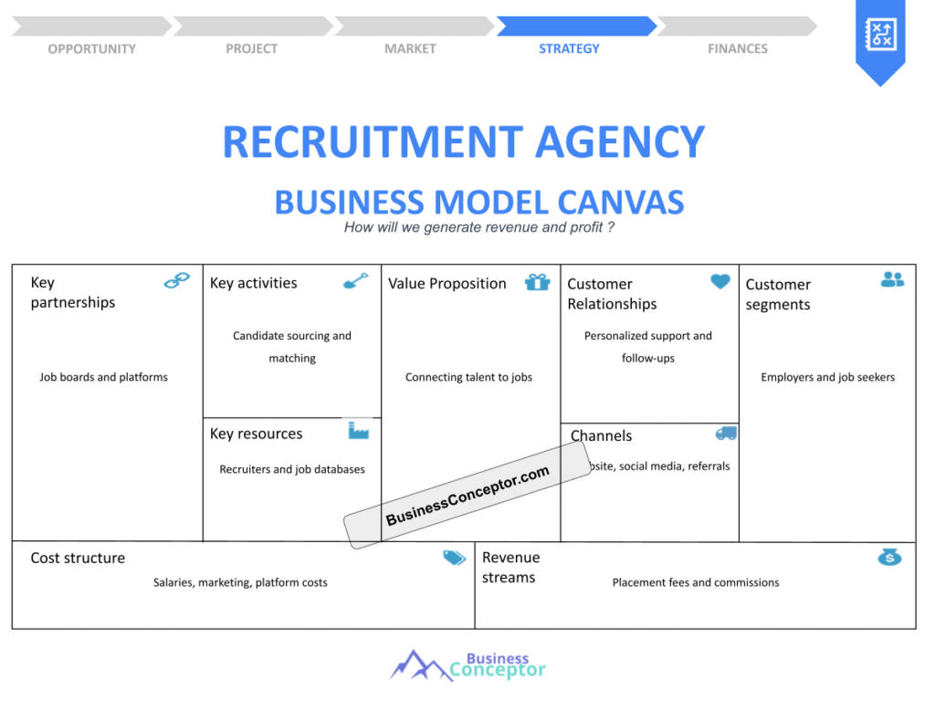 Let’s break down the key components of the Recruitment Agency Business Model Canvas. These include:
