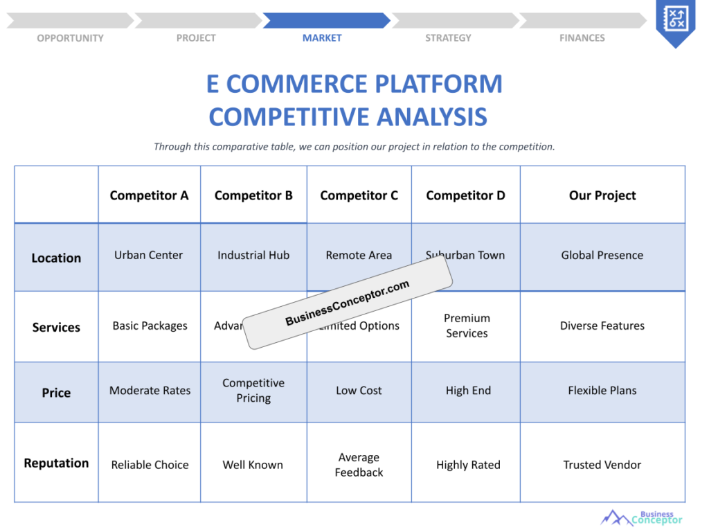 A E Commerce Platform Competition Study is an analysis that evaluates competing e-commerce platforms to understand their strengths, weaknesses, features, and market strategies. This study helps businesses identify opportunities for differentiation and improvement in their own platforms.