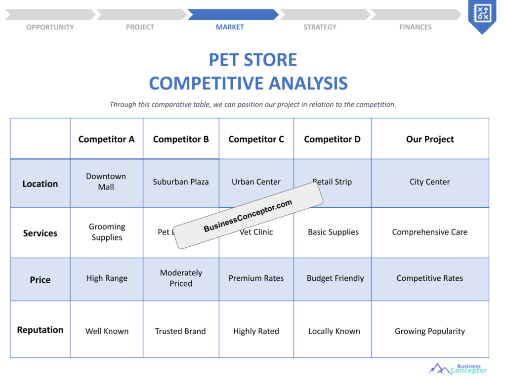When performing competitor analysis for pet retailers, consider factors such as product variety, customer engagement, marketing techniques, and pricing strategies. This comprehensive understanding will help you identify gaps in your offerings and develop strategies to differentiate your store.