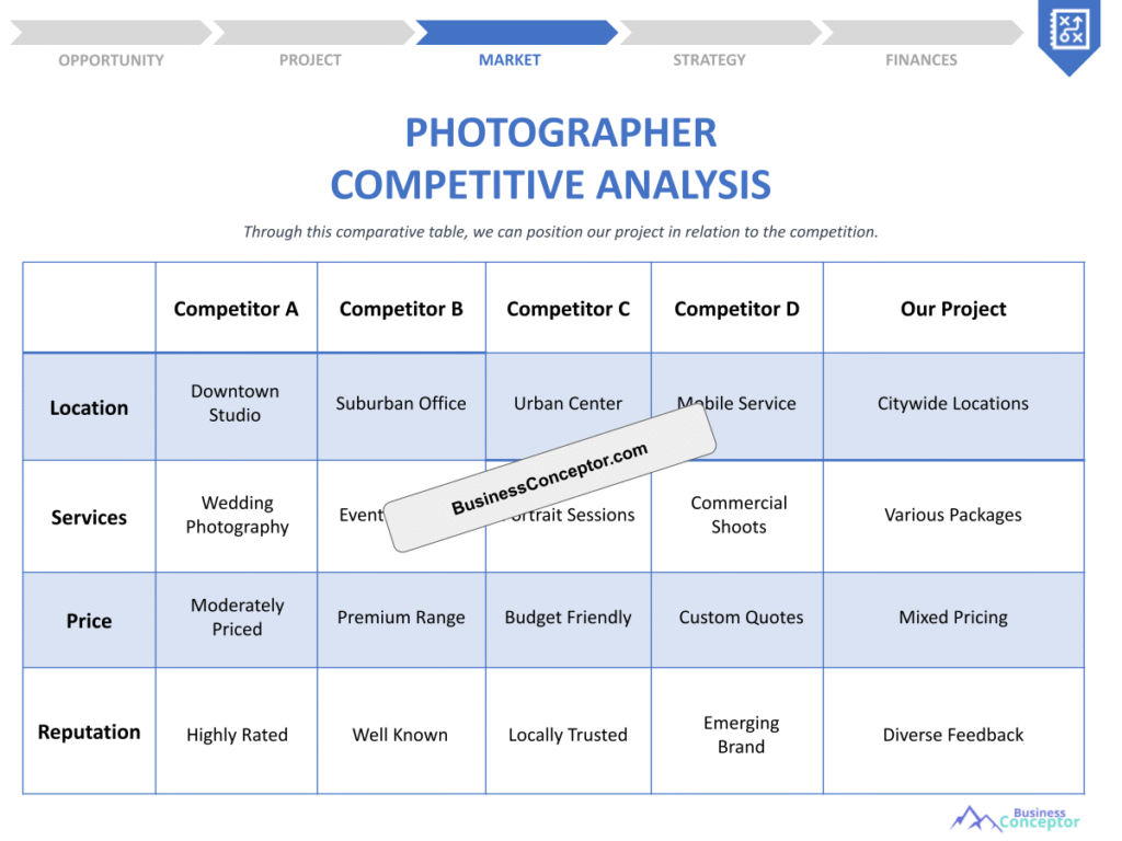 In summary, conducting a Photographer Competition Study is essential for any photographer looking to thrive in a competitive market. By identifying your competitors, analyzing their work, understanding their marketing strategies, and learning from their mistakes, you can carve out a niche that showcases your unique talents and services. To further support your journey, consider utilizing a comprehensive Photographer Business Plan Template. This resource will help you structure your business effectively and set clear goals for growth.