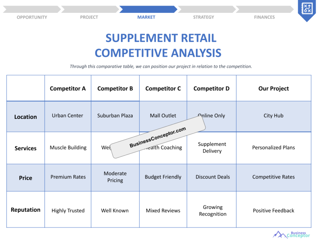 Ultimately, the goal of a Supplement Retail Competition Study is to help you craft a competitive advantage. Analyzing all the insights gathered from previous sections allows you to identify how you can position your brand uniquely in a crowded marketplace. This involves synthesizing data on your competitors’ strengths and weaknesses, consumer preferences, and market trends to carve out a niche that resonates with your target audience.