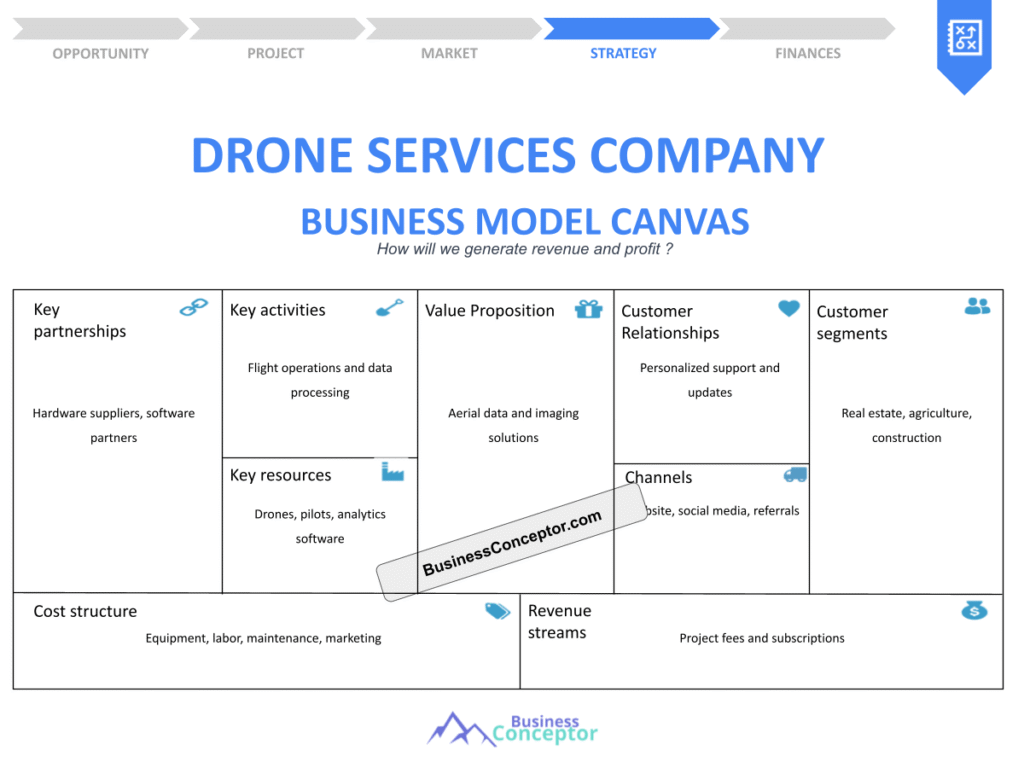 The Business Model Canvas is a visual chart that includes elements describing a company’s value proposition, infrastructure, customers, and finances. For drone services companies, this model serves as a blueprint for understanding how to deliver value through their unique offerings. By using this tool, you can identify what makes your service stand out in the crowded drone industry.