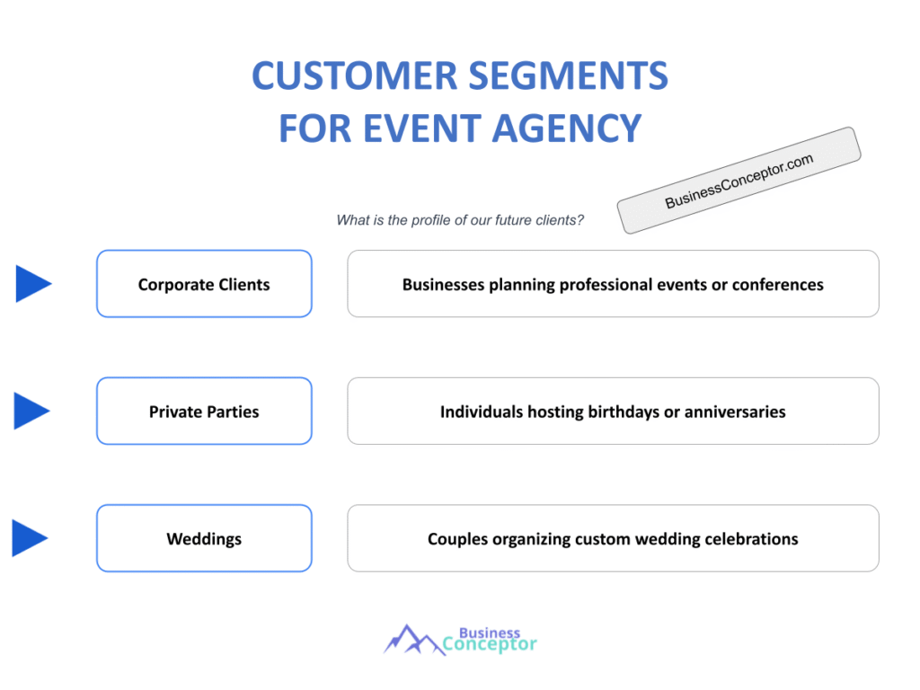 Key segments in the event planning industry include corporate clients, weddings, non-profit events, and educational gatherings. Understanding the needs and characteristics of these segments allows agencies to tailor their services and marketing strategies effectively.