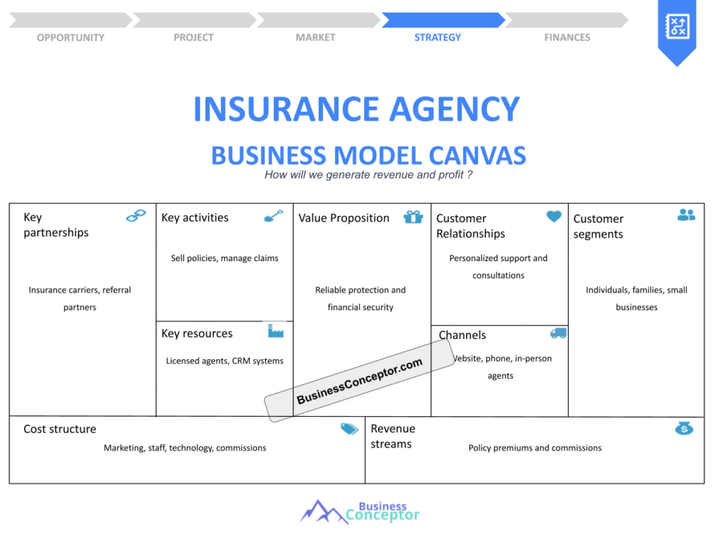 A business model canvas for insurance agents is a visual framework that outlines the essential components of an insurance agency’s operations. It includes sections for value propositions, customer segments, revenue streams, key activities, and more. This tool helps agents strategize and understand how their agency functions, making it easier to identify areas for improvement.