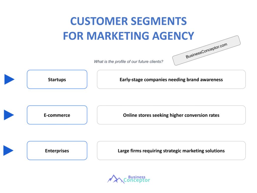 When discussing customer segments for marketing agencies, it’s important to recognize that clients come in various forms, each requiring a unique approach. The primary categories are B2B (business-to-business) and B2C (business-to-consumer). Each type has its own characteristics and needs, which necessitate different marketing strategies.