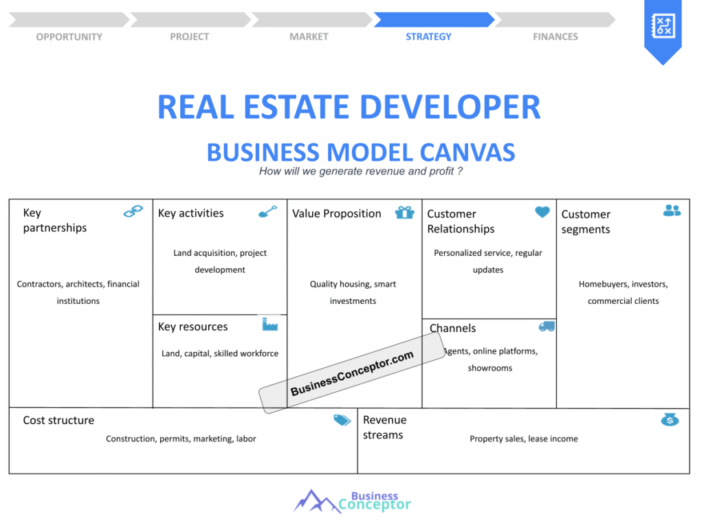 By comprehensively addressing these components, the Business Model Canvas equips real estate developers with the insights needed to create a robust business strategy. For instance, knowing your customer segments helps you design properties that resonate with your target market, while a clear understanding of your value proposition ensures that your offerings stand out in a crowded marketplace.