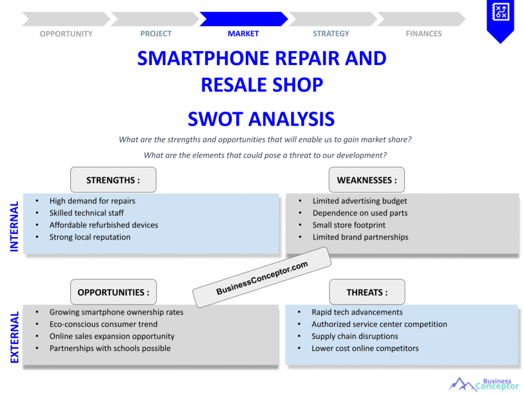 - The significance of conducting a SWOT analysis for your smartphone repair and resale shop.