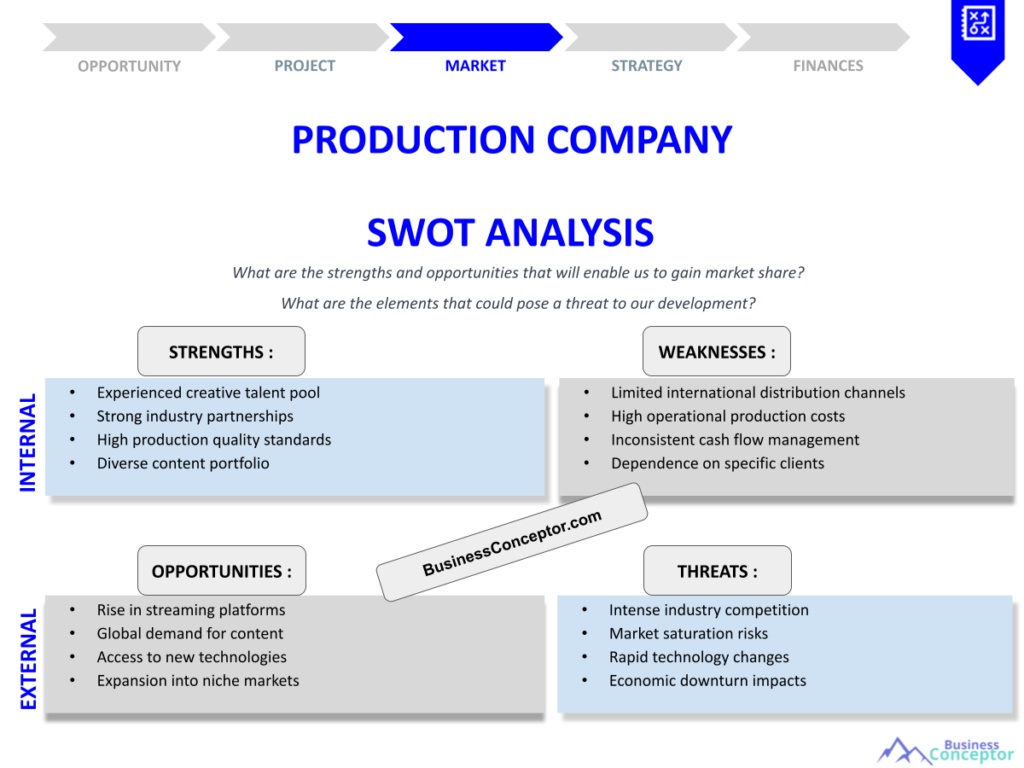A SWOT analysis for a film production company is a strategic tool that helps identify the company’s strengths, weaknesses, opportunities, and threats. This analysis enables production companies to evaluate their internal capabilities and external market conditions, which is essential for strategic planning and decision-making.