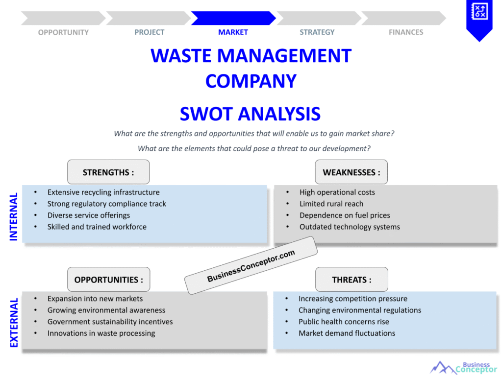 A SWOT analysis for waste management companies involves evaluating their strengths, weaknesses, opportunities, and threats. This analysis helps businesses identify internal capabilities and external challenges, enabling informed strategic planning and decision-making.
